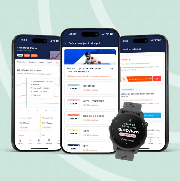 Campus, c’est l’app d’entraînement qui t’accompagne jusqu’à la ligne d’arrivée ! Tu bénéficies d’un plan 100 % personnalisé, qui s’adapte à ton objectif et ton profil. Les séances s’exportent directement sur ta montre (Garmin, Coros, Suunto) ou Strava, et tu profites aussi de renforcement musculaire pour booster tes performances et éviter les blessures.
